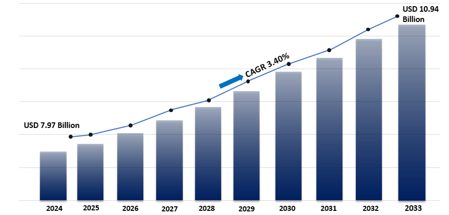 Mining Chemicals Market Forecast (2025–2033): The mining chemicals market size is expected to reach USD 10.94 Billion by 2033, growing at a CAGR of 3.40%.