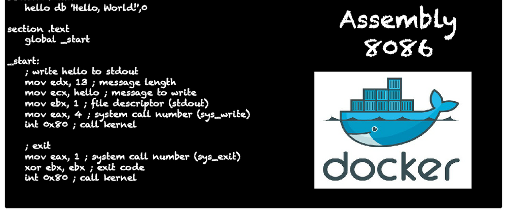 Not too long ago, I wrote a blog post on how to make a basic "Hello world" application in 8086 assembly language. It would be amazing if I could containerize the code so that it's easier for me and others to access it without worrying about downloading all of the proper dependencies each time. To that end, I decided to look into using Docker. So here is the Dockerfile I used to containerize the same application.