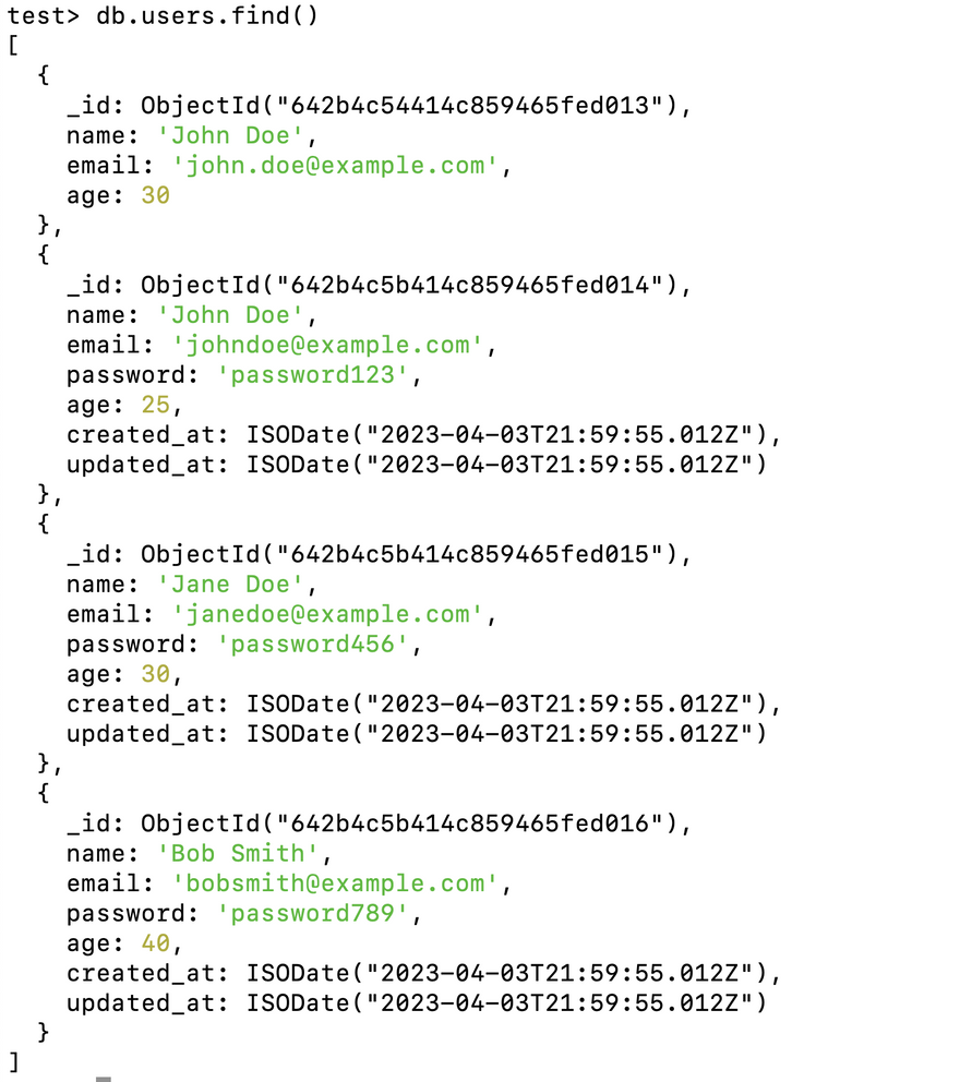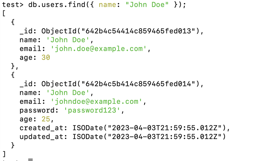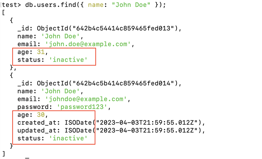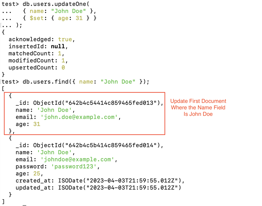 This will update the first document in the users collection where the name field is "John Doe", setting the age field to 31. Since we have multiple document matching this name you will see output something similar to this,