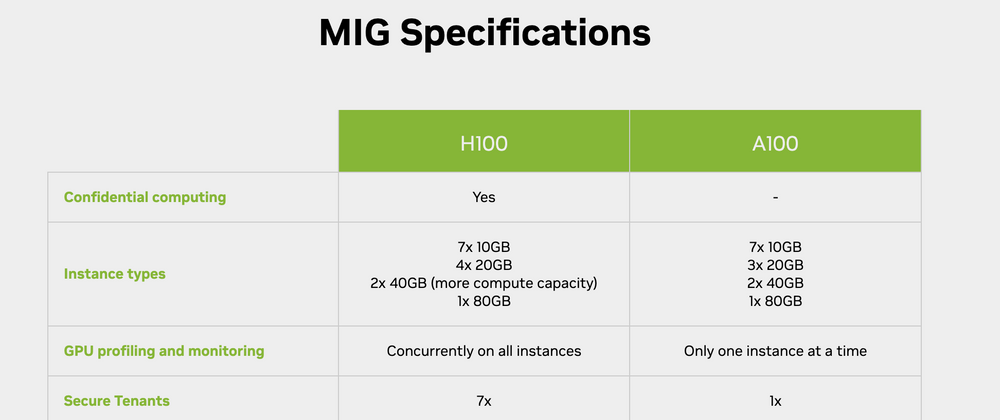 - Multi-Instance GPU (MIG): Both support MIG, but Hopper introduces new MIG capabilities like LLM Engine and PCIe Gen 5, enabling finer-grained resource allocation and improved bandwidth for demanding parallel workloads.