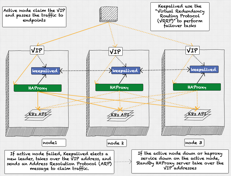 - If active node failed, Keepalived elects a new leader, takes over the VIP address, and sends an Address Resolution Protocol (ARP) message to claim traffic.