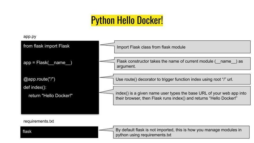 This code creates a basic Flask app that responds to requests to the "/" route with the string "Hello Docker!".