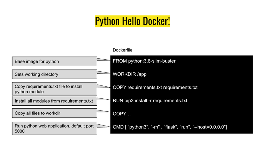 - CMD ["python3", "-m" , "flask", "run", "--host=0.0.0.0"]: Specify the command to run when the image is executed as a container. This command will start a Flask development server accessible on port 5000 of your Docker host.