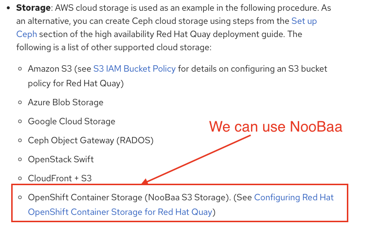 Install NooBaa: The NooBaa provides an object storage solution and is required for the Quay registry. But there is no separate operator at the moment and NooBaa is a part of ODF operator. So you have to install ODF operator to make it work. Or try some other Object storage solution like Minio which is available through operator hub.