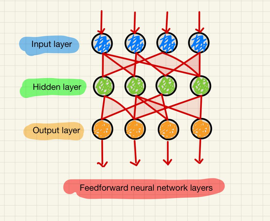 A Feedforward Neural Network, also simply known as a Neural Network, is a type of artificial neural network where connections between the nodes do not form a cycle. This is different from recurrent neural networks.