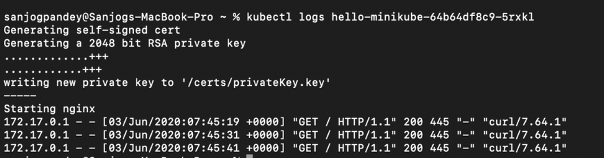 The HTTP request has made via your Kubernetes Service. And once you check your logs, you will see the following,