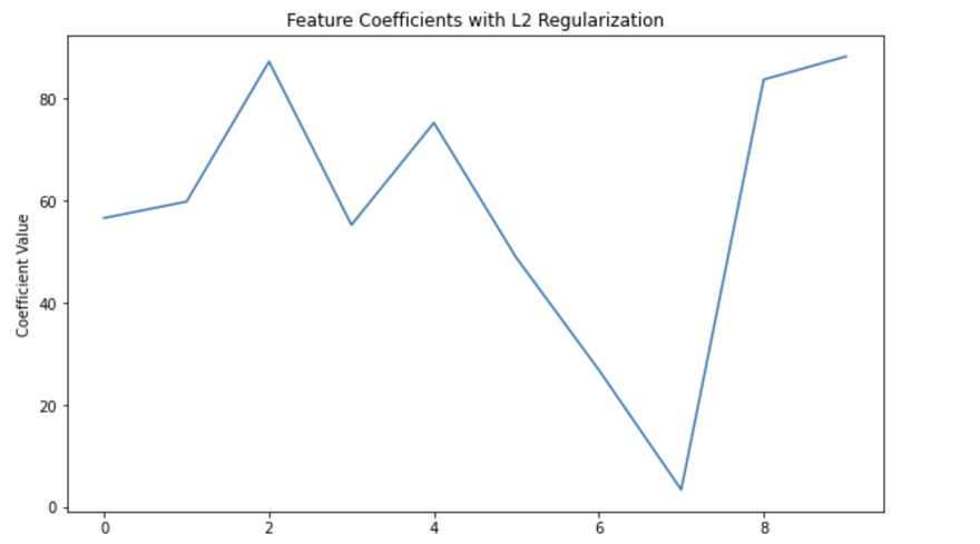 L2 regularization (Ridge regression): The penalty term is the square of the magnitude of coefficients. This generally results in smaller coefficients, but it doesn't eliminate them completely.
