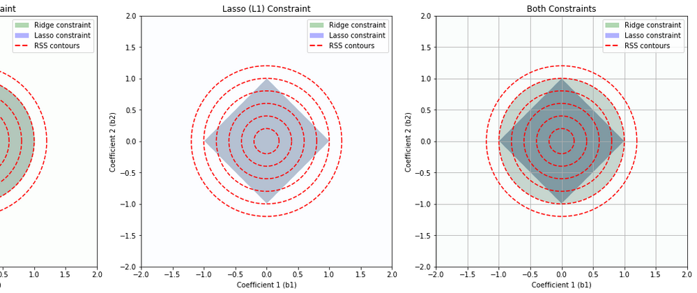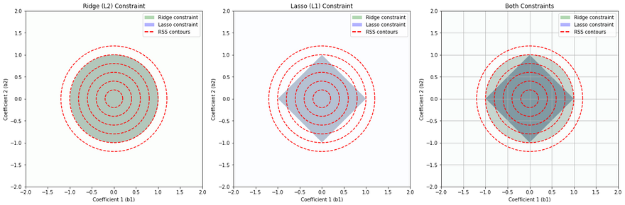Both Constraints (Rightmost Plot): This plot shows the constraints from both Ridge and Lasso regularization overlaid. The overlapped region shows the set of coefficient values that would be allowed by both Ridge and Lasso.