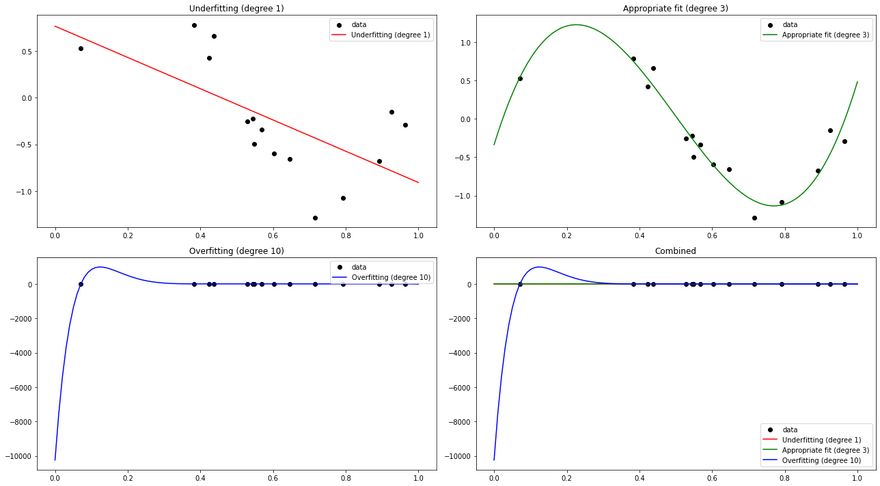 Let's demonstrate this by creating a simple example using polynomial regression, a type of linear regression where the relationship between the independent variable x and the dependent variable y is modeled as an nth degree polynomial.