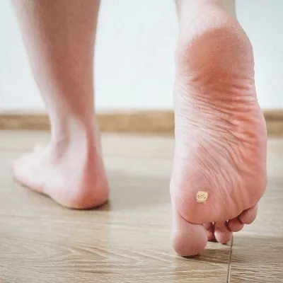 Plantar warts: Appear on the soles of the feet and can be painful when walking.