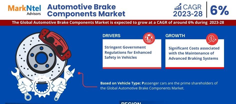 Stringent Government Regulations for Enhanced Safety in Vehicles- Â Governments of various countries worldwide are laying out strict regulations for automakers to include enhanced safety features in vehicles, owing to which technologies like ABS (Anti-lock Brake Systems), BA (Brake Assist), EBD (Electronic Brakeforce Distribution), & AEB (Advanced Emergency Braking) have gained traction in the past few years, in order to reduce road accidents. ABS provides enhanced vehicle stability & directional control and aids in minimizing stopping distance when hard brakes are applied. On the other hand, BA is based on ABS technology & is used usually in combination with ABS to reduce the stopping distance by around 45%. Next is EBD, i.e., the extended version of ABS that helps distribute equal force to each wheel and offers benefits like improved traction, better stability, & enhanced braking efficiency. Hence, the burgeoning adoption of these technologies by automakers to comply with stringent government regulations is projected to drive the Global Automotive Brake Components Market during 2023-28.