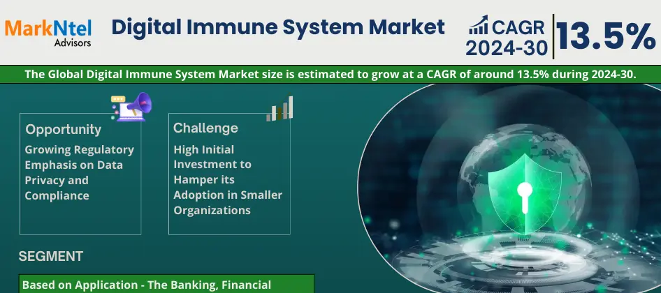 According to the latest report by MarkNtel Advisors, titled “Global Digital Immune System Market By Component (Solution, Services), By Security Type (Network Security, Cloud Security, Endpoint Security, Internet of Things (IoT) Security, Others (Application Security, Data Security, etc.)) By Application (IT & Telecommunication, Manufacturing, Banking, Financial Services and Insurance (BFSI), Education, Healthcare, Government, Others (Retail & E-commerce, Defense, etc.)), By Deployment Mode (On-premise, Cloud), The Global Digital Immune System Market size is estimated to grow at a CAGR of around 13.5% during the forecast period, i.e., 2024-30. The report provides a thorough analysis of the market, covering competitor dynamics, regional insights, and a detailed breakdown of industry segments.