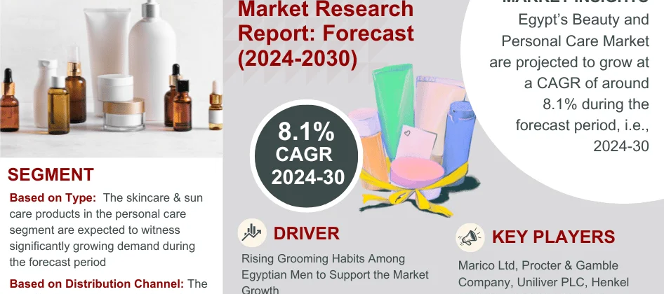 According to the latest report by MarkNtel Advisors, titled “Egypt Beauty and Personal Care Market By Type (Personal care [Hair Care, Skin Care, Sun Care, Bath and Shower, Oral Care, Deodorants, Perfumes, and Antiperspirants, Men’s Grooming Products, Baby Care Products], Cosmetic products [Facial Make-up Products, Eye Make-up Products, Lip and Nail Make-up Products, Hair styling and Colouring products]), By Distribution Channel (Speciality Stores, Cosmetic Store, Drug Store, Large & Small Retail Stores, Hypermarkets & Supermarkets, Departmental Stores, Others, E- Commerce Platforms), and Others, The Egypt’s Beauty and Personal Care Market are projected to grow at a CAGR of around 8.1% during the forecast period, i.e., 2024-30. The report provides a thorough analysis of the market, covering competitor dynamics, regional insights, and a detailed breakdown of industry segments.