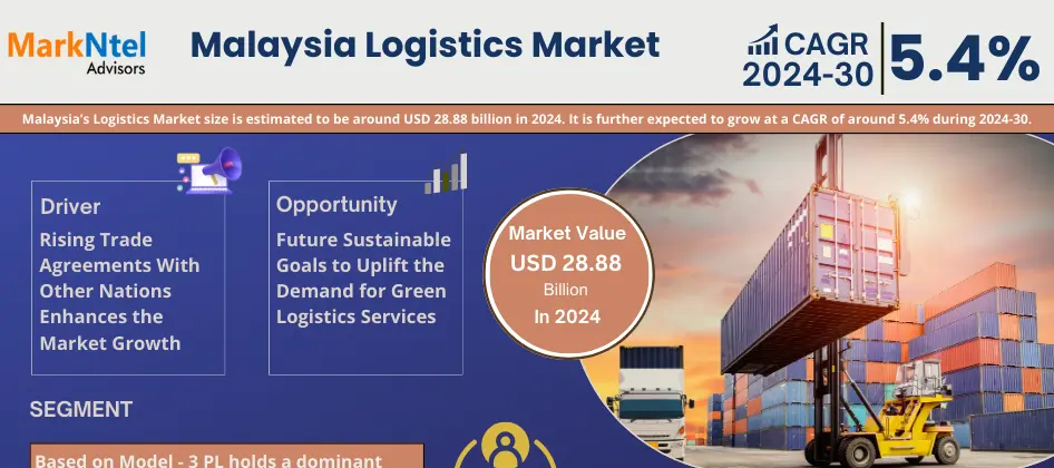 According to the latest report by MarkNtel Advisors, titled “Malaysia Logistics Market By Model (First-Party Logistics (1 PL), Second-Party Logistics (2 PL), Third-Party Logistics (3 PL), Fourth-Party Logistics (4 PL)), By Transportation Mode (Air, Rail, Road, Sea and Inland Waterways), By End User (Healthcare & Pharmaceuticals, Construction, Energy & Chemicals, Retail & E-Commerce, Food & Beverage, Consumers Goods, Others (Automotive, Semiconductor, etc.)), and Others, The Malaysia’s Logistics Market size is estimated to be around USD 28.88 billion in 2024. It is further expected to grow at a CAGR of around 5.4% during the forecast period, i.e., 2024-30. The report provides a thorough analysis of the market, covering competitor dynamics, regional insights, and a detailed breakdown of industry segments.