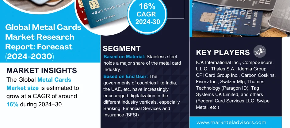 According to the latest report by MarkNtel Advisors, titled “Global Metal Cards Market By Type (Banking Cards, [Credit, Debit], Health Insurance Cards, Travel Cards, Loyalty & Rewards Cards), By Material (Stainless Steel, Titanium, Brass,Copper, Gold, Silver, Others (Aluminum, Platinum, etc.)), By Technology (EMV Chip, Near Field Communication (NFC), Magnetic Stripe, Others (Biometric Authentication, RFID)), By End User, (Banking, Financial Services and Insurance (BFSI), Retail & E-Commerce, Travel and Hospitality Companies), Others, The Global Metal Cards Market size is estimated to grow at a CAGR of around 16% during the forecast period, i.e., 2024–30. The report provides a thorough analysis of the market, covering competitor dynamics, regional insights, and a detailed breakdown of industry segments.