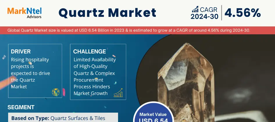 According to the latest report by MarkNtel Advisors, titled “Global Quartz Market By Type (Quartz Surface & Tile, High-purity Quartz, Quartz Glass, Quartz Crystal, Quartz Sand, Others), By End User (Building & Construction, Medical, Electronics & Semiconductor, Solar, Optical Fiber & Telecommunication) and Other, The Global Quartz Market size is valued at USD 6.54 Billion in 2023 & is estimated to grow at a CAGR of around 4.56% during the forecast period, i.e., 2024-30. The report provides a thorough analysis of the market, covering competitor dynamics, regional insights, and a detailed breakdown of industry segments.