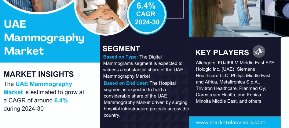 According to the latest report by MarkNtel Advisors, titled “UAE Mammography Market By Type (Analog Mammograms, Digital Mammograms, (2D Mammography, 3D Mammography (Digital Breast Tomosynthesis))), By End User (Hospitals Diagnostic Centers, Specialty Clinics, Ambulatory Surgical Centers, Education & Research Institutes), and Others, The UAE Mammography Market is estimated to grow at a CAGR of around 6.4% during the forecast period, i.e., 2024-30. The report provides a thorough analysis of the market, covering competitor dynamics, regional insights, and a detailed breakdown of industry segments.