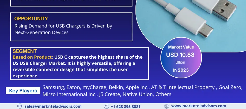 <p>According to the latest report by <strong>MarkNtel Advisors</strong>, titled “<strong><a href="https://www.marknteladvisors.com/research-library/us-usb-charger-market.html">US USB Charger Market</a> By Product (USB A, USB B, USB C), By Charger Type (Wall Charger, Portable Power Banks/Docking System/Alarm Clock, Car Charger), By Port Type (One, Two, Others), By Power (Up to 30W, 31W – 45W, 46W – 60W, 61W – 75 W, Above 75W), By Application (Smartphone, Laptop, Tablet, Desktop, Others), By Multiport (Multi-Port with Fixed Power, Multi-Port with Fluctuation Power, Same Port with Fluctuation Power, Different Port with Fluctuation Power), By Distribution Channel (Online, Offline [Organized, Unorganized]), </strong>The <strong>US USB Charger Market </strong>size is valued at around<strong> USD 10.88 billion in 2023 </strong>and is estimated to grow at a<strong> CAGR </strong>of about <strong>7.2% </strong>during the forecast period, i.e.,<strong> 2024-30. </strong>The report provides a thorough analysis of the market, covering competitor dynamics, regional insights, and a detailed breakdown of industry segments.</p>