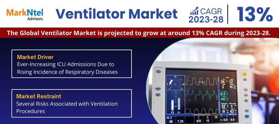 Ever-Increasing ICU Admissions Due to Rising Incidence of Respiratory Diseases - The mounting prevalence of both chronic & acute respiratory illnesses like COPD, bronchial asthma, acute lung injury, and hypoxemia, among others, due to the increasing number of tobacco consumers worldwide, is the primary factor anticipated to drive the Global Ventilator Market during 2023-28. With the constantly rising incidence of such diseases, the world is witnessing rapidly increasing ICU admissions as patients with these conditions require critical care equipment, including ventilators, the demand for which is surging at a significant pace globally.