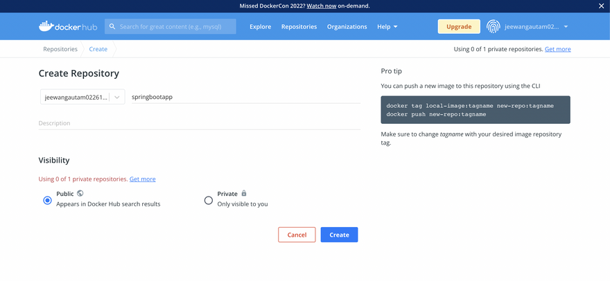 Step 2 β Click the button "Create Repository" on the above screen and create a repository with the name springbootapp. Make sure that the visibility of the repository is public