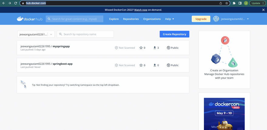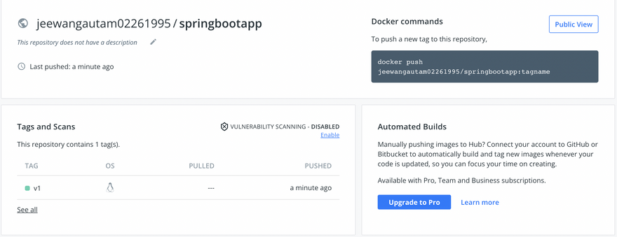 Step 3 β Now go back to the Docker Host. Here we need to tag our jeewangautam02261995/springbootapp:v1 to the new repository created in Docker Hub. We can do this via the Docker tag command.