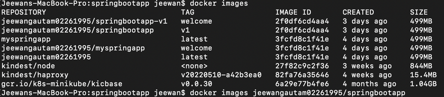 Here, we have our jeewangautam02261995/springbootapp:v1 image which was created before. Letβs use this to upload to the Docker public repository Docker Hub.