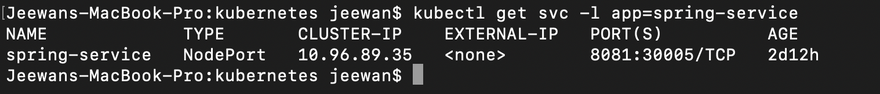 you can see, spring-service is. NodePort type assigned IP 10.96.89.35 and which will listen port '30005' and forward the traffic to pod's port '8081'.