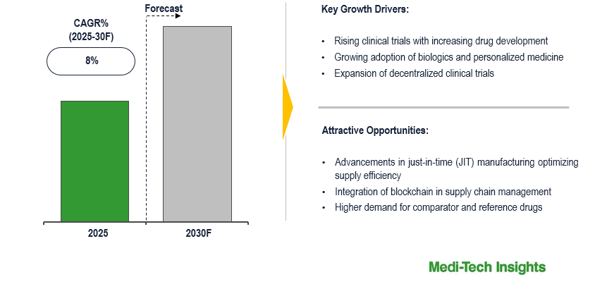 This report by Medi-Tech Insights provides the size of the global clinical trial supplies market at the regional- and country-level from 2023 to 2030. The report further segments the market based on phase, product & service, therapeutic area and end-user.