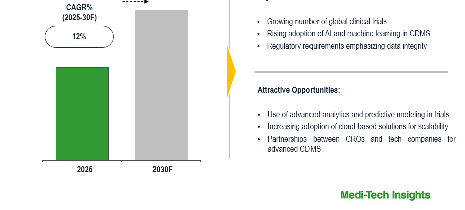 The clinical data management systems market is expected to grow at a robust CAGR of 12% from 2025 to 2030. This growth is driven by the rising number of global clinical trials, stringent regulatory requirements, advancements in AI and cloud technologies, increasing adoption of decentralized trial approaches and expanding research activities in emerging markets. However, challenges such as high implementation costs, integration complexities, and data security concerns pose constraints to market expansion.