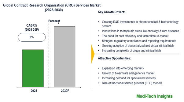 The global contract research organization (CRO) services market is expected to witness a growth rate of 9% in the next five years. Growing R&D investments in pharmaceutical and biotechnology sectors; innovations in therapeutic areas like oncology, and rare diseases; the need for cost-efficiency & faster time-to-market; stringent regulatory compliance/reporting, growing adoption of decentralized and virtual clinical trials, and increasing complexity of drugs and clinical trials are some of the key factors driving the CRO services market growth.