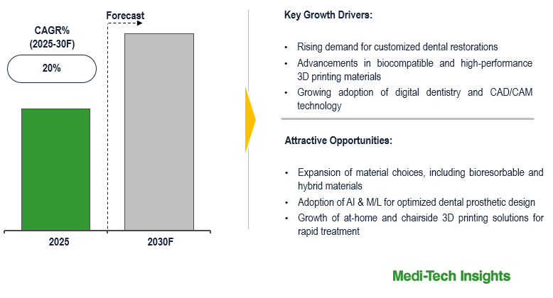 This report by Medi-Tech Insights provides the size of the global dental 3D printing market at the regional- and country-level from 2023 to 2030. The report further segments the market based on technology, application, and end-user.