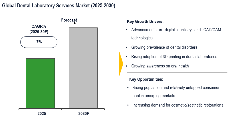 The global dental laboratory services market is projected to grow at a CAGR of 7% from 2025 to 2030, driven by advancements in digital dentistry, the increasing demand for aesthetic restorations, and growing adoption of CAD/CAM technology. The integration of 3D printing and innovative materials further fuels market expansion.