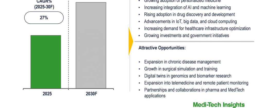 The global healthcare digital twin market is estimated to be approximately US$ 2.1 billion in 2024 and is set to witness a growth rate of ~27% in the next 5 years. Growing adoption of personalized medicine; increasing integration of AI and machine learning; rising adoption in drug discovery and development; advancements in IoT, big data, and cloud computing; increasing demand for healthcare infrastructure optimization; and growing investments and government initiatives are some of the key factors driving the healthcare digital twin market.