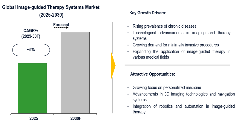 The image-guided therapy systems market is projected to grow at a CAGR of ~5% over the forecast period. Major factors driving the growth include the rising prevalence of chronic diseases, technological advancements in imaging and therapy systems, growing demand for minimally invasive procedures, rising geriatric population, expanding application of image-guided therapy in various medical fields, and integration of AI, robotics, and augmented reality (AR) into image-guided surgeries.