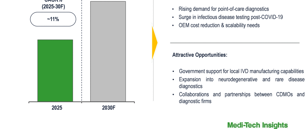 In an endeavor to cut result time and help patients make better-informed decisions about their health, there is considerable demand for IVD testing to move closer to the patient, i.e. point-of-care (POC) diagnostics, whether in the hospital, clinic, physician's office, or home. Manufacturing of specific PoC devices presents manufacturers (OEMs) with a variety of design and manufacturing challenges. For instance, the ability to process high-precision components that involve reagents and fluids are the most relevant capabilities sought by OEMs, which are accomplished by specialized IVD CDMOs.