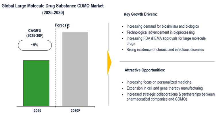 The large molecule drug substance CDMO market is anticipated to expand at a CAGR of ~9% during the forecast period. Key drivers of this growth include increasing demand for biosimilars and biologics, technological advancement in bioprocessing, increasing FDA & EMA approvals for large molecule drugs, rising incidence of chronic and infectious diseases, growing investments in biologics manufacturing by pharma and biotech companies, and expanding biotech sectors in emerging markets.
