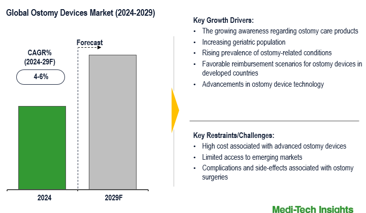 The global ostomy devices market is expected to grow at a CAGR of 4-6% in the next five years. The growing awareness regarding ostomy care products; increasing geriatric population; rising prevalence of ostomy-related conditions such as colorectal and bladder cancer, inflammatory bowel diseases (IBD), and urological disorder; favorable reimbursement scenarios for ostomy devices in developed countries; growing preferences for home-based stoma care; and advancements in ostomy device technology are some key factors driving the ostomy devices market.