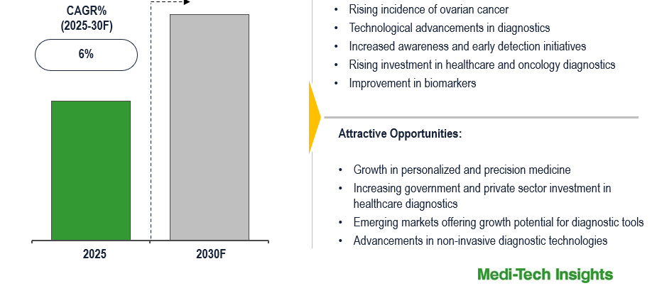 The global ovarian cancer diagnostics market is set to witness a growth rate of ~6% in the next 5 years. Rising incidence of ovarian cancer, technological advancements in diagnostics, increased awareness and early detection initiatives, rising investment in healthcare and oncology diagnostics, improvement in biomarkers are some of the key factors driving the ovarian cancer diagnostics market.