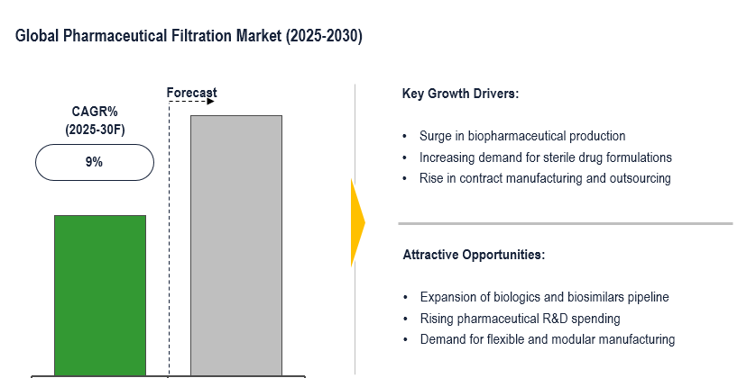 The pharmaceutical filtration market is experiencing a steady growth with a CAGR of around 9% during the forecast period. The market growth is primarily fueled by the increasing production of biologics, stringent regulatory requirements for drug safety, and the growing adoption of single-use filtration systems. Additionally, a growing number of contract manufacturing organizations (CMOs), increasing spending on R&D, and a need for higher-purity forms of drugs further fuel market development. However, the high cost of equipment and procedure complexity might hinder market growth.