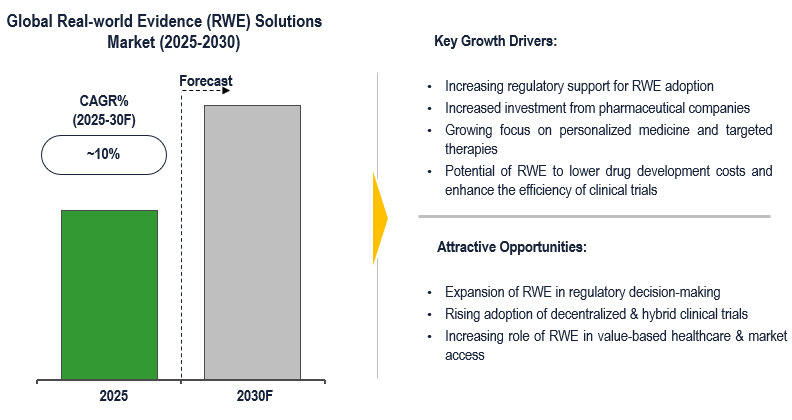 The real-world evidence (RWE) solutions market is expected to expand at a CAGR of ~10% during the forecast period. Key factors driving this growth include increasing regulatory support for RWE adoption, the rising incidence of chronic diseases, increased investment from pharmaceutical companies, the growing focus on personalized medicine and targeted therapies, the widespread adoption of electronic health records (EHRs) and digital health data, and the potential of RWE to lower drug development costs and enhance the efficiency of clinical trials.