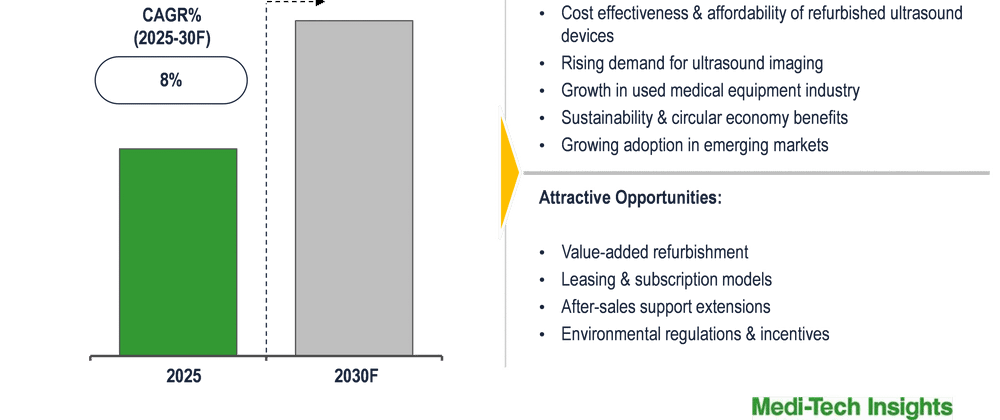 The global refurbished ultrasound devices market is set to witness a CAGR of ~8% in the next 5 years. Cost effectiveness & affordability of refurbished ultrasound devices, rising demand for ultrasound imaging, growth in used medical equipment industry, sustainability & circular economy benefits, growing adoption in emerging markets, and favorable regulatory trends, are some of the key factors driving the refurbished ultrasound devices market.