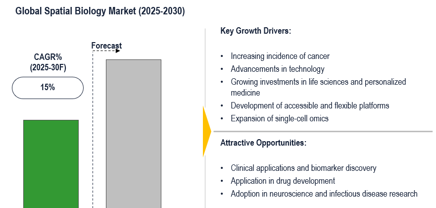 The global spatial biology market is set to witness a CAGR of ~15% in the next 5 years. Increasing incidence of cancer, advancements in technology, growing investments in lif e sciences and personalized medicine, development of accessible and flexible platforms, and expansion of single-cell omics, are some of the key factors driving the spatial biology market.