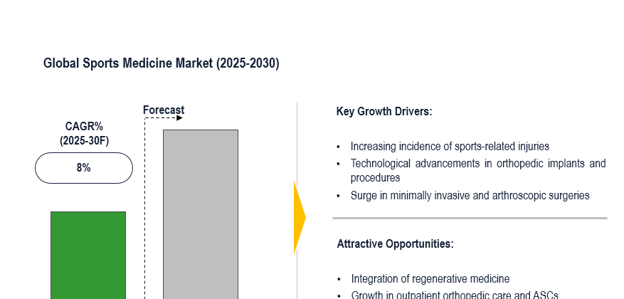 The global sports medicine market was valued at approximately $6.1 billion in 2024 and is expected to grow at a rate of ~8% during the forecast period. The growing cases of sports injuries, technological advancements and new product innovations in sports medicine, rising demand for minimally invasive surgeries, development in regenerative medicine, and an increasing awareness of the importance of physical fitness and sports activities are some of the key factors driving the market growth.