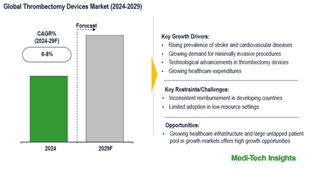 The global thrombectomy devices market is projected to grow at a CAGR of 6-8% from 2024 to 2029. This growth is primarily driven by an increasing prevalence of stroke and cardiovascular diseases, demand for minimally invasive procedures, and technological advancements in thrombectomy devices. Expansion in emerging markets, combined with an aging population prone to vascular diseases, is expected to further propel market growth.