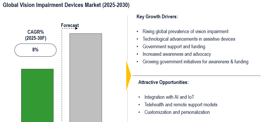 The vision impairment devices market is a growing market that is expected to gain further momentum in the coming years due to an increase in the development of smart technology, a favorable regulatory landscape, increasing investments from private equity, venture capitalists, and government globally, and aggressive organic and inorganic growth strategies followed by players.