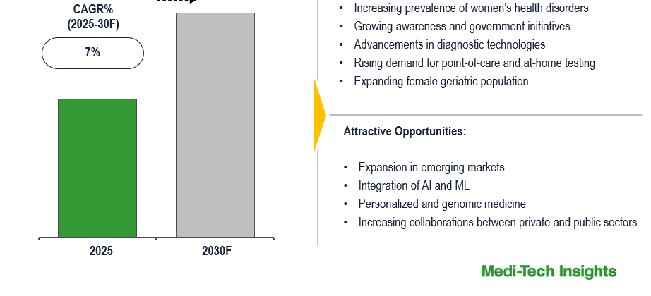 The global women’s health diagnostics market is set to witness a growth rate of ~7% in the next 5 years. Increasing prevalence of women’s health disorders, growing awareness and government initiatives, advancements in diagnostic technologies, rising demand for point-of-care and at-home testing, and expanding female geriatric population are some of the key factors driving the women’s health diagnostics market.