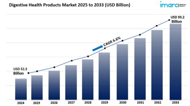 The global digestive health products market size was valued at USD 52.3 Billion in 2024. Looking forward, IMARC Group estimates the market to reach USD 93.2 Billion by 2033, exhibiting a CAGR of 6.6% during 2025-2033.