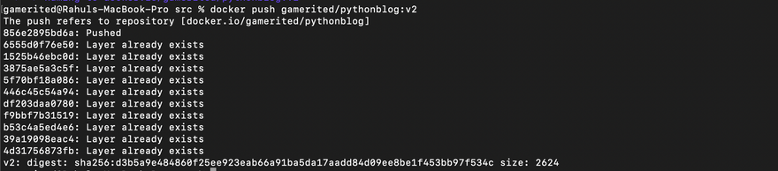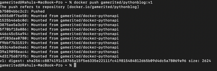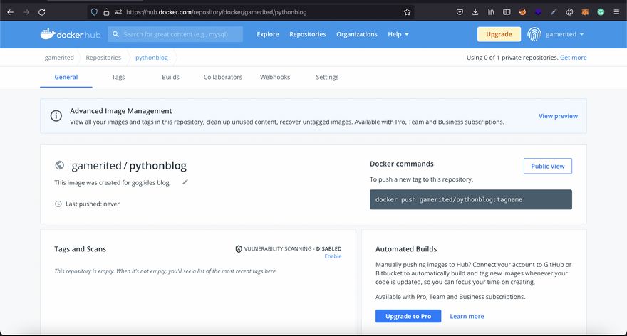 Note: Your repository name always starts with your username, followed by your image name. Here gamerited is my username, and pythonblog is my image name.