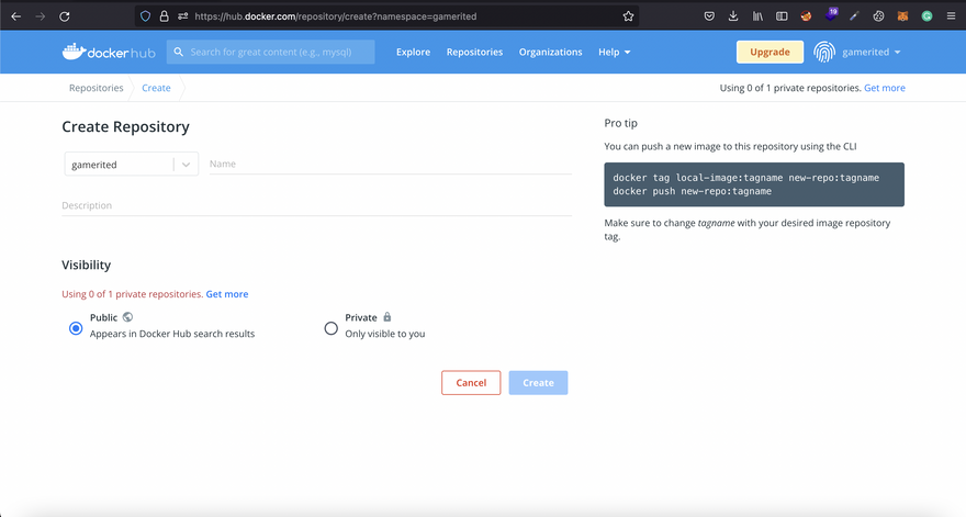 2) Now, Name our image to be pushed. In this case, I will name it pythonblog. We can also add a description. And also, set the Visibility to Public and click on create