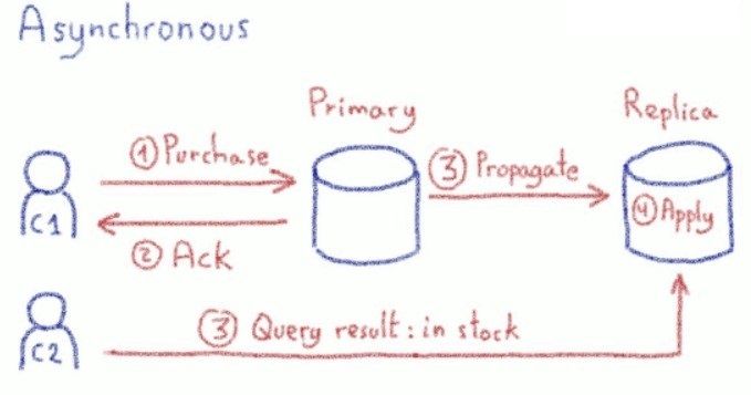 Buying an item is a write query as you need to update the stock, so you must perform it on the primary node. Displaying the webpage is a read query, so you decide to perform it on a replica node. What happens for the second customer if he/she displays the webpage at the same exact moment that the first customer receives the purchase confirmation? Does he see the item as in or out of stock.